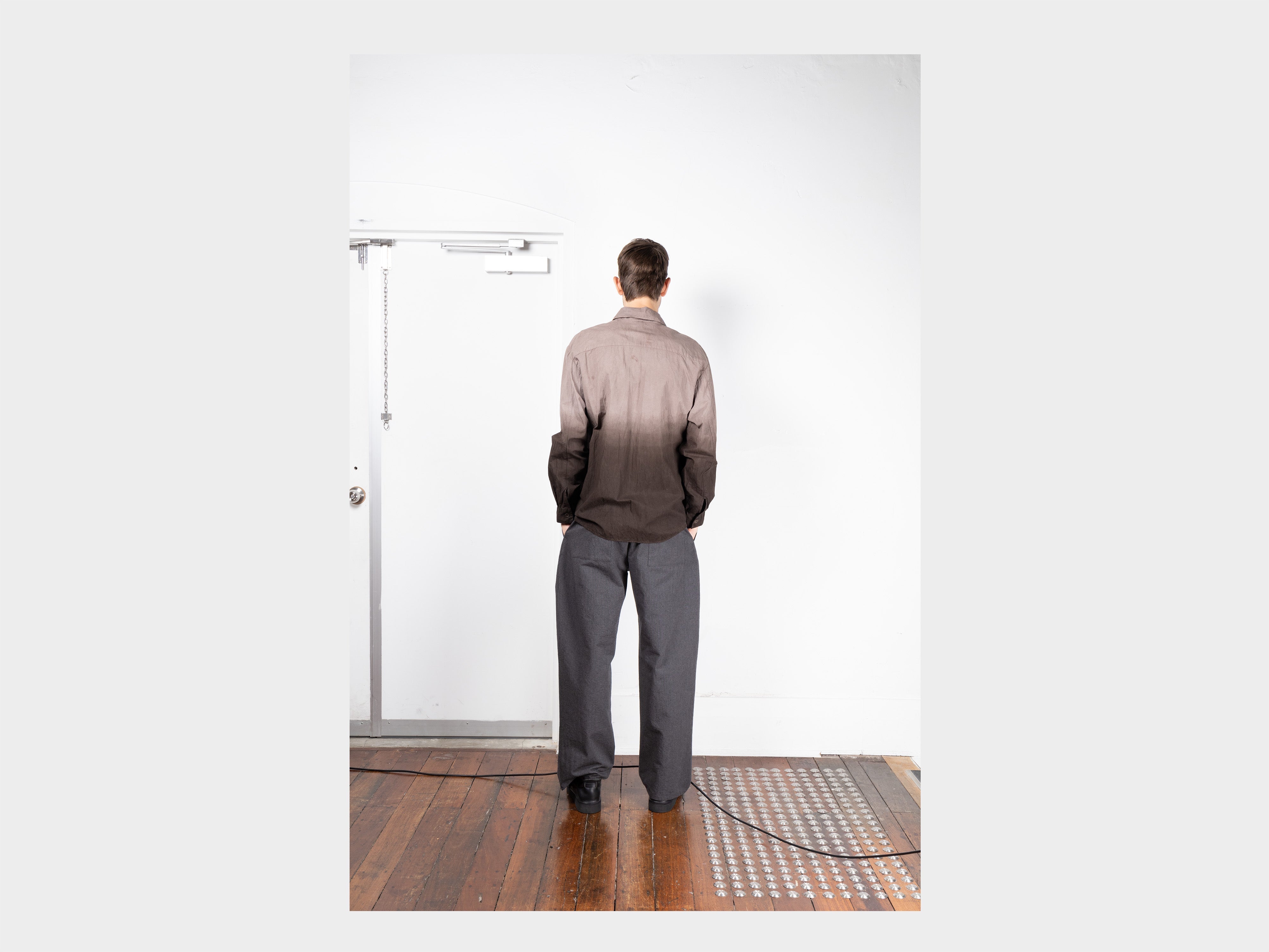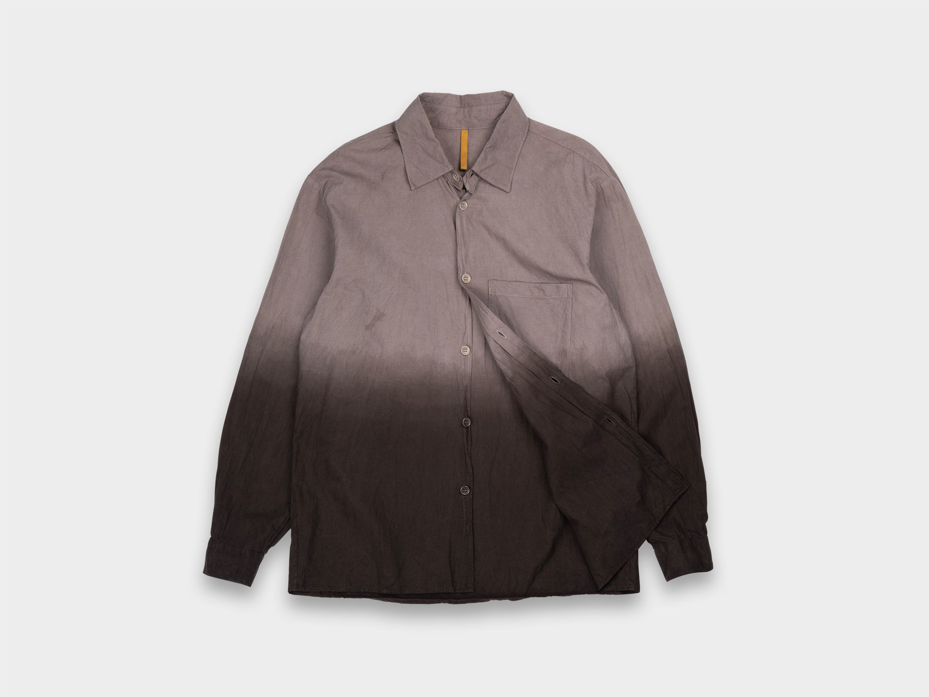 +Relaxed, straight-cut shirt. Generous room through armholes, relaxed sleeves with single button closure, high stand collar, button front, large left-chest pocket. This shirt is designed to be naturally overdyed. Dyeing commissioned to iconic mud works Kanai Kougei, based in Amami-Ōshima. Master craftsman Yukihito Kanai preserves the ancient Dorozome techniques of the island, while expressing his fascination with gradation and exploring new combinations of colour using materials within reach. Made in Japan.