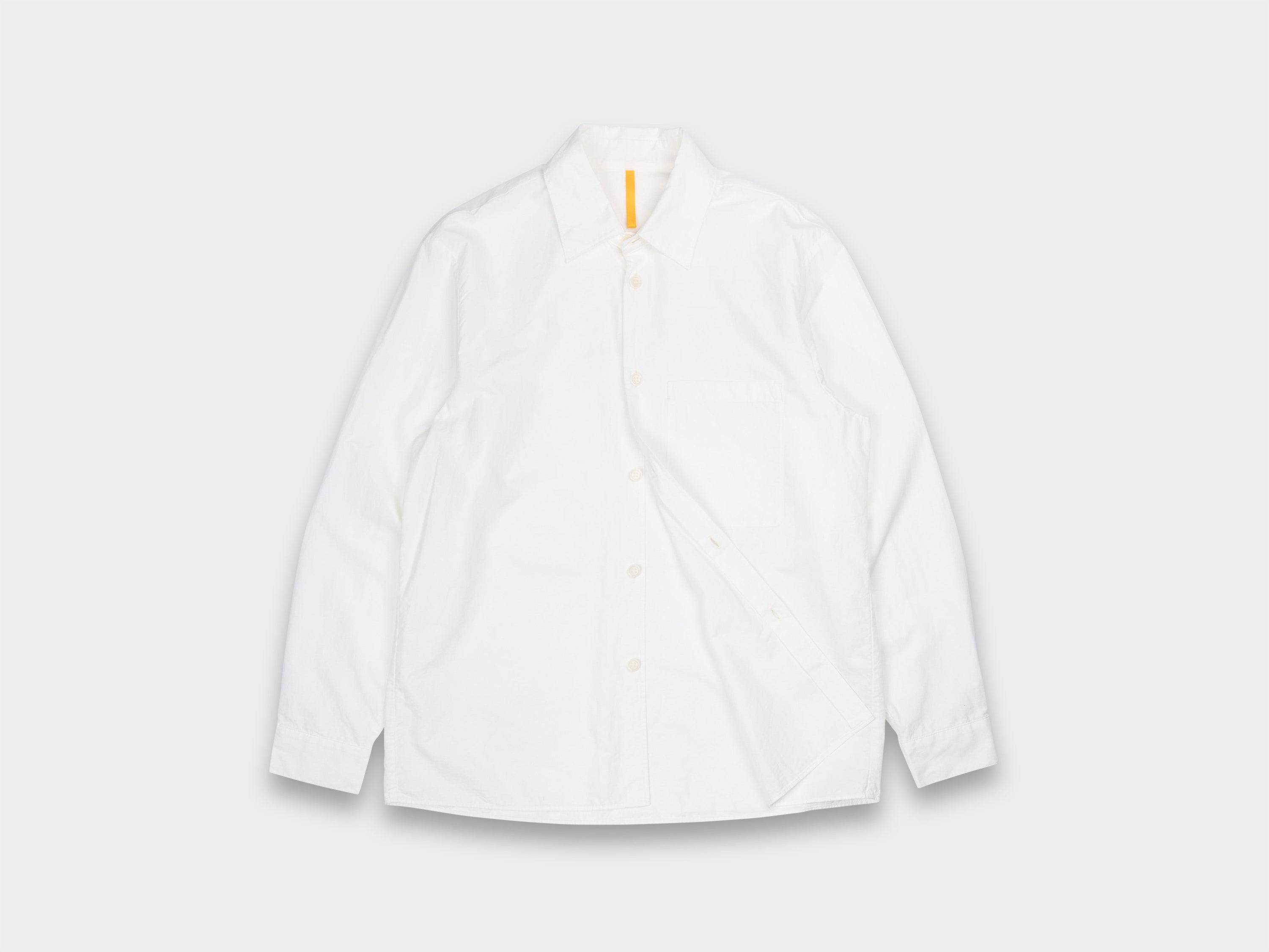 +Relaxed, straight-cut shirt. Generous room through armholes, relaxed sleeves with single button closure, high stand collar, button front, large left-chest pocket. Made in Japan.