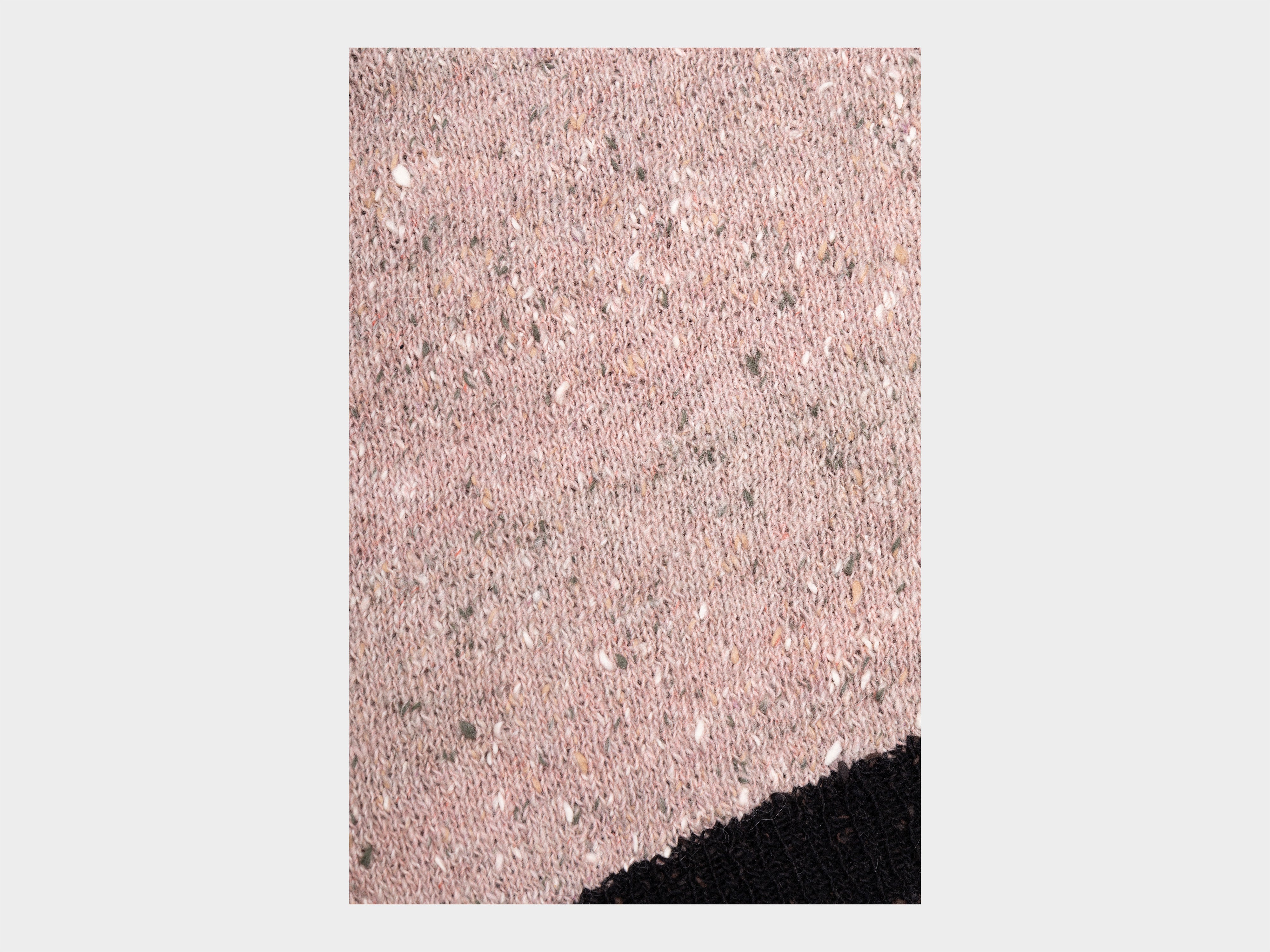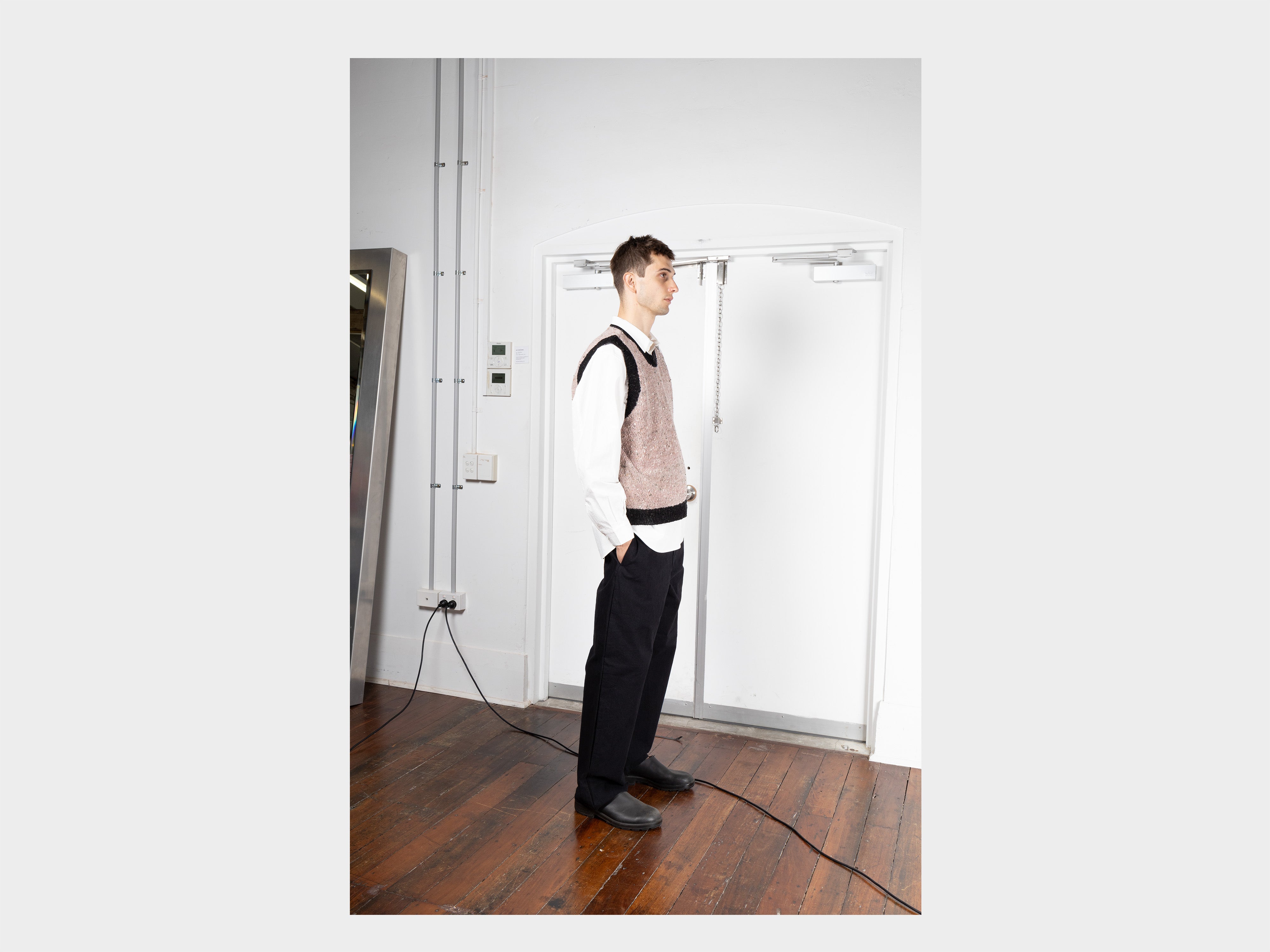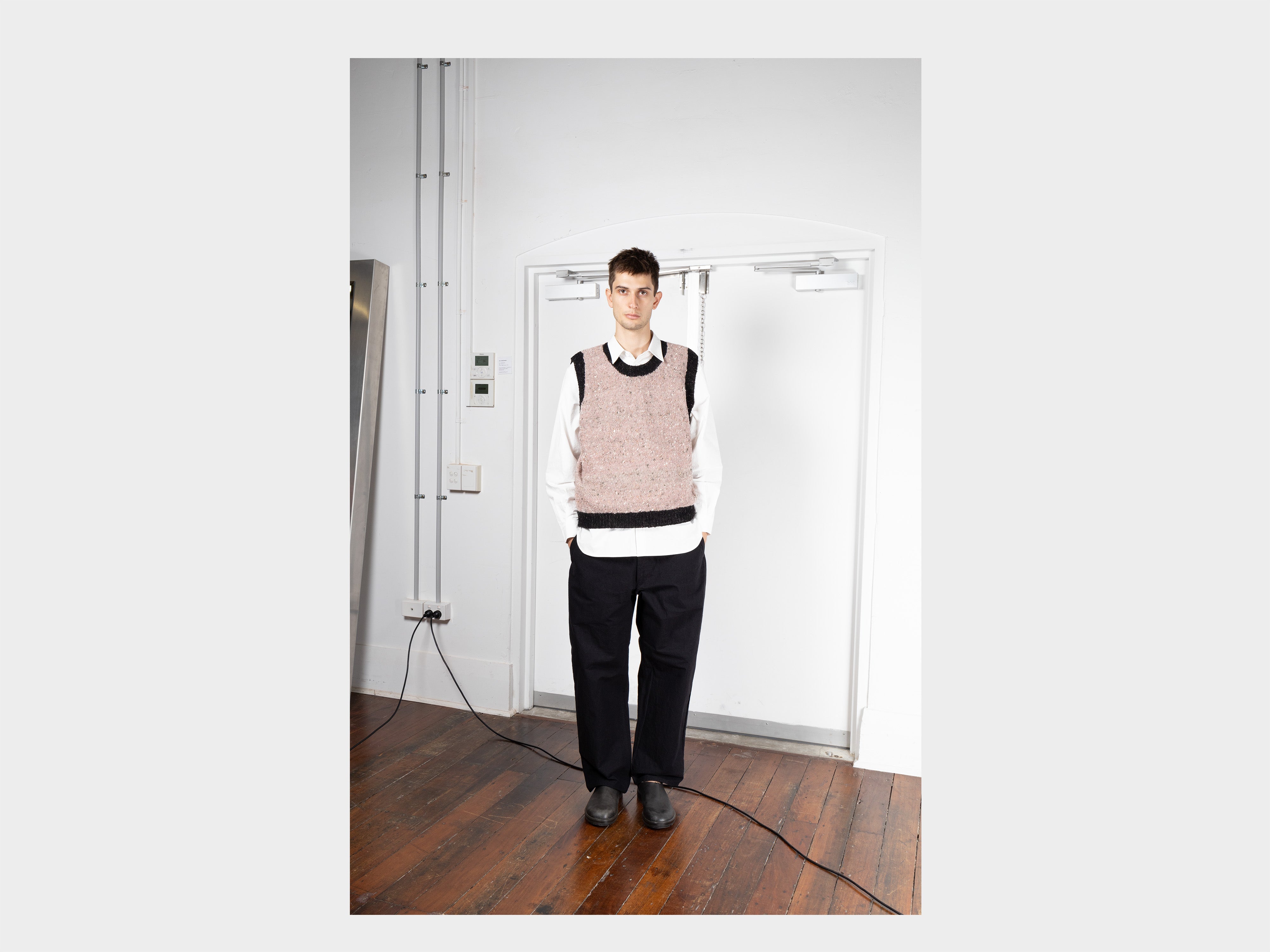 Hand-knitted vest made in partnership with Tohoku Crochet. Knitted by a team of craftspeople in the tsunami-affected region of north-east Japan, using a fine, wiry, composite slub yarn. Through teaching and supplying raw materials, the project aims to employ those who have otherwise lost their livelihood. Relaxed-fit, softly textured, lightweight and warming.