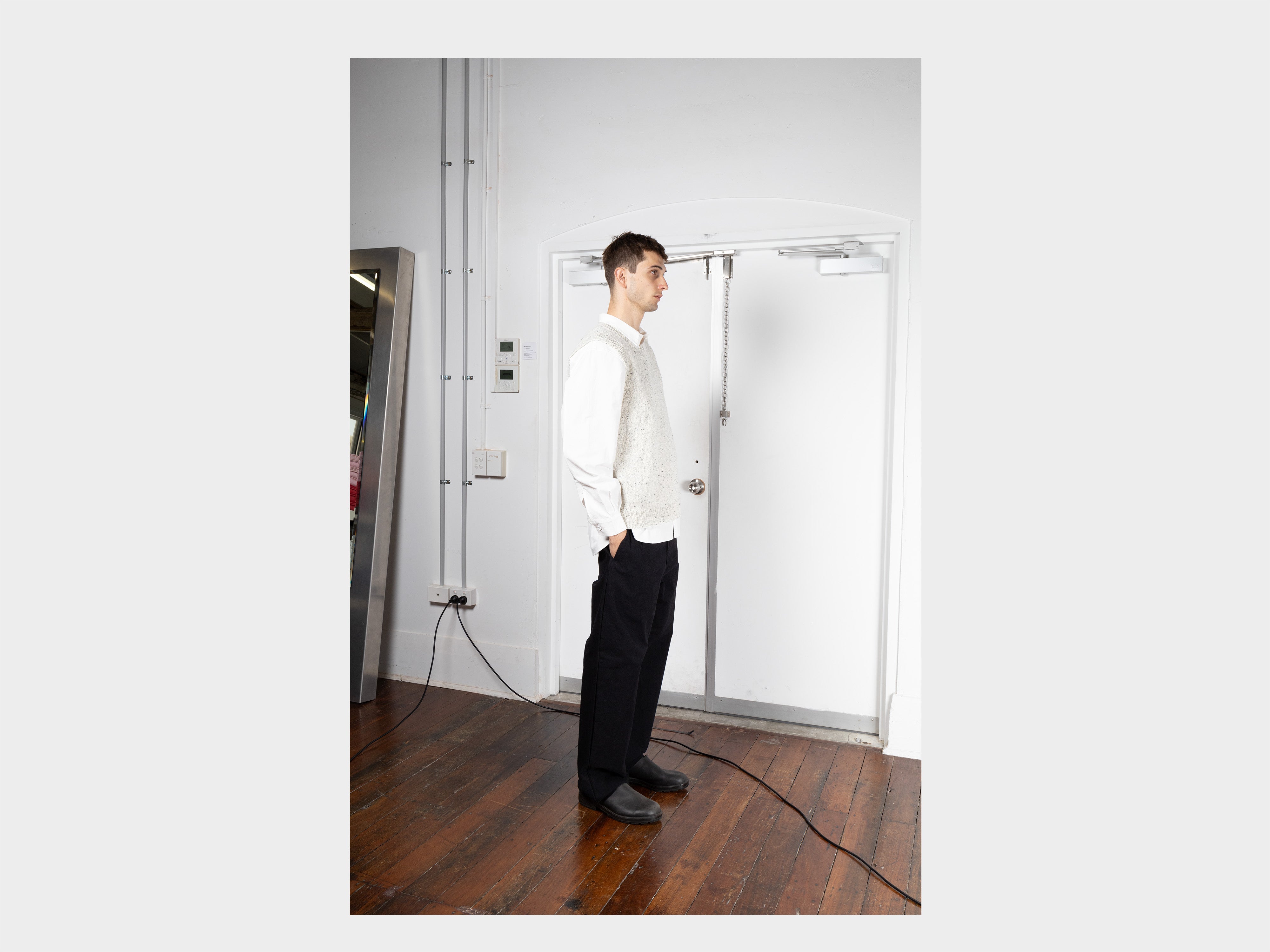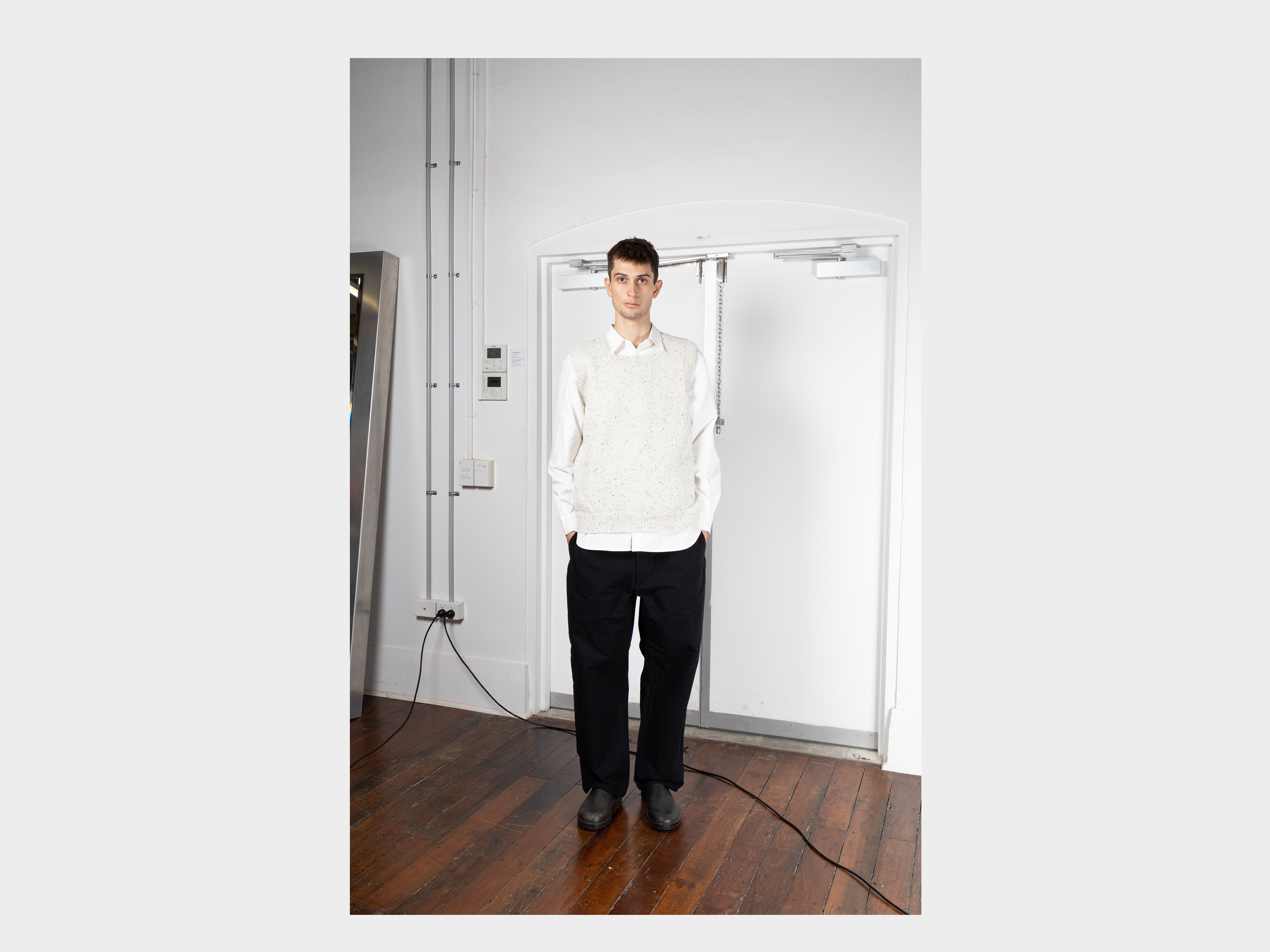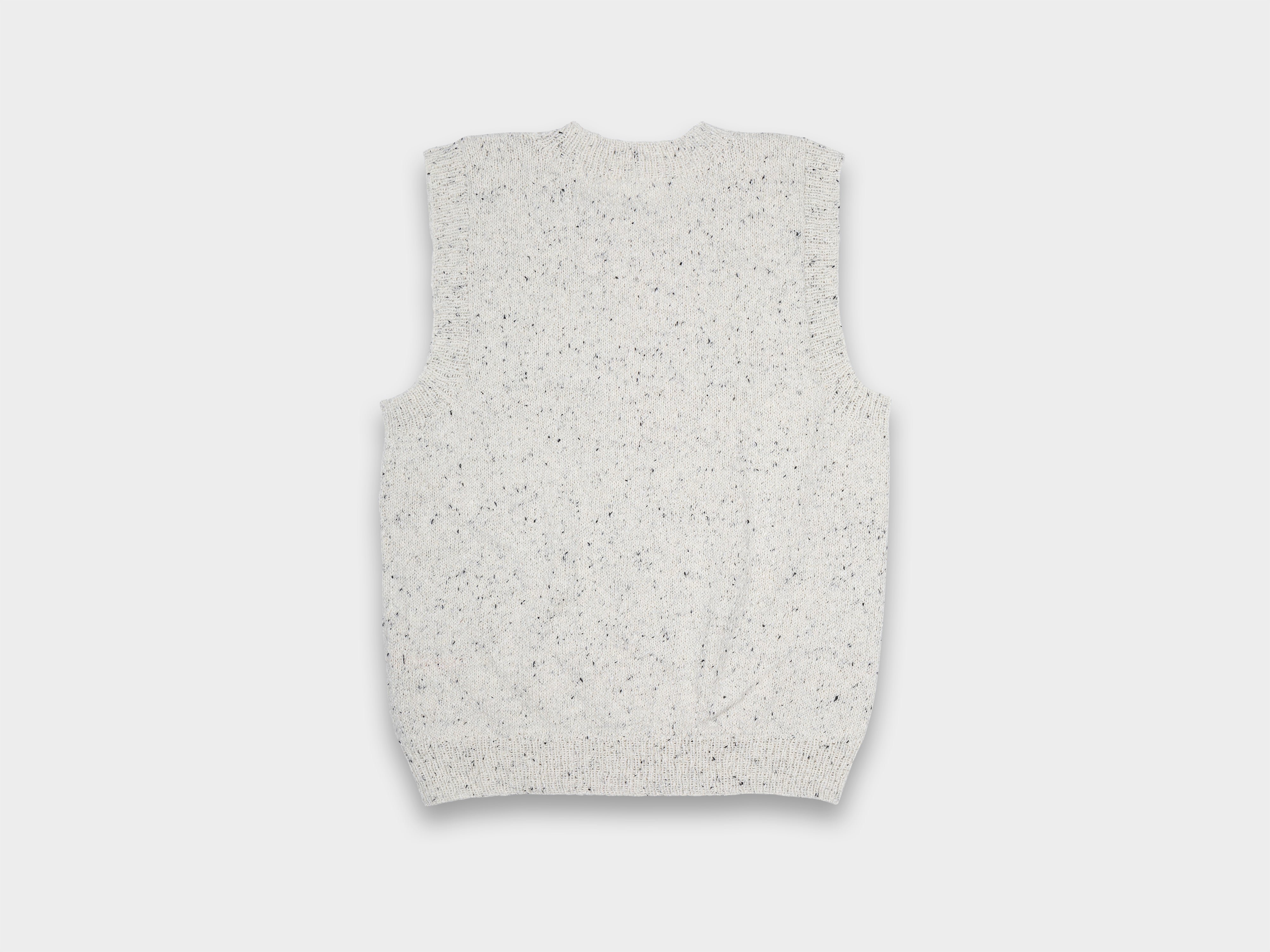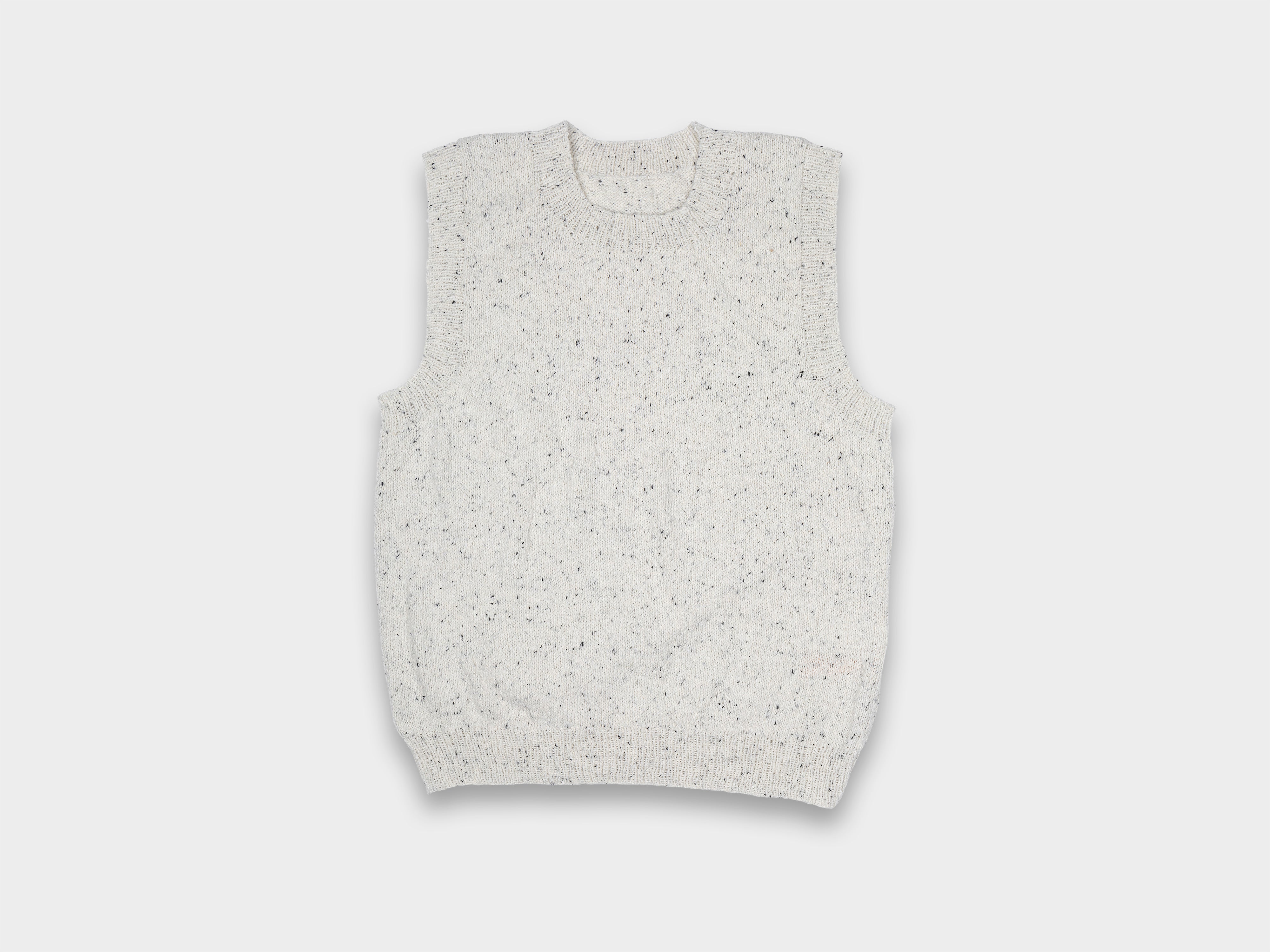 +Hand-knitted vest made in partnership with Tohoku Crochet. Knitted by a team of craftspeople in the tsunami-affected region of north-east Japan, using a fine, wiry, composite slub yarn. Through teaching and supplying raw materials, the project aims to employ those who have otherwise lost their livelihood. Relaxed-fit, softly textured, lightweight and warming.