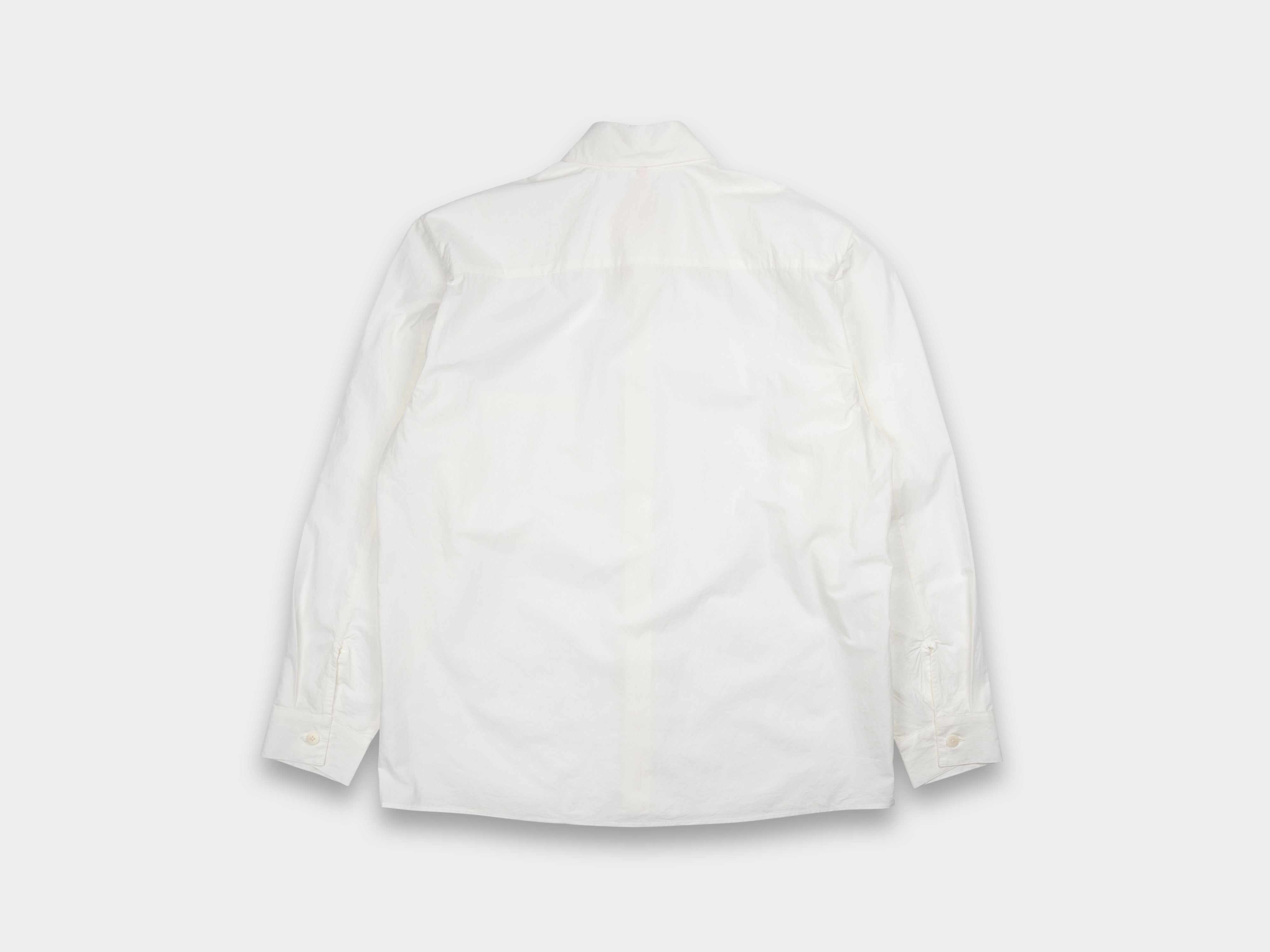 +Relaxed, straight-cut shirt. Generous room through armholes, relaxed sleeves with single button closure, high stand collar, button front, large left-chest pocket. Made in Japan.