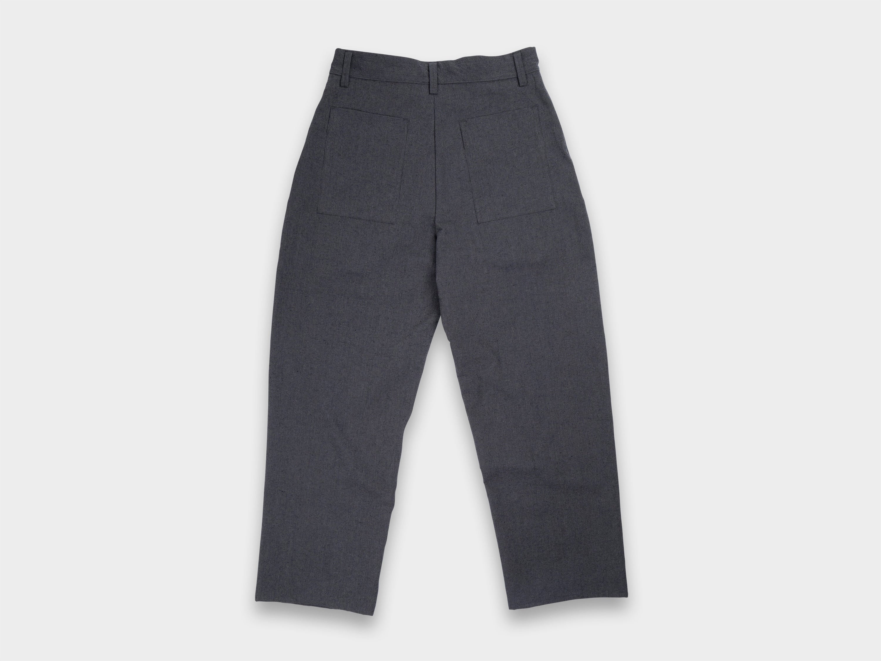 +Relaxed wide-leg pants. Long rise and generous room in the hips. Seat belt tape with adjustable button at the front, side-seam pockets and back patch pockets. Made in Japan.