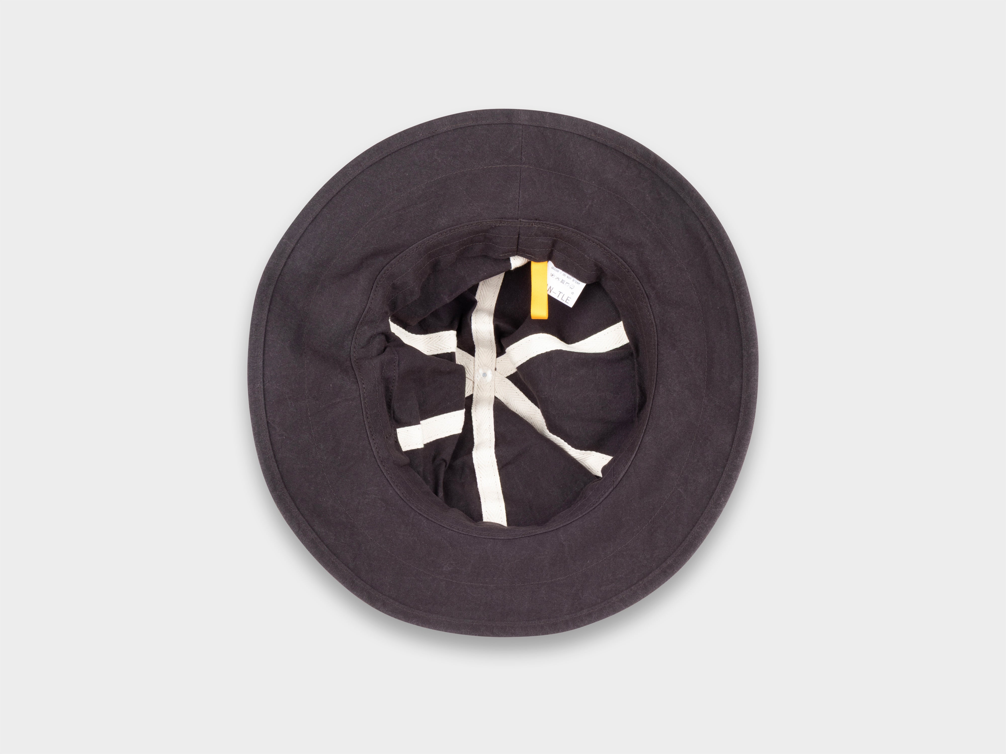 +Deep-cut six panel brim hat. Slot button threaded onto seatbelt tape, used to adjust size. Cinch to distort shape. Made in Japan.