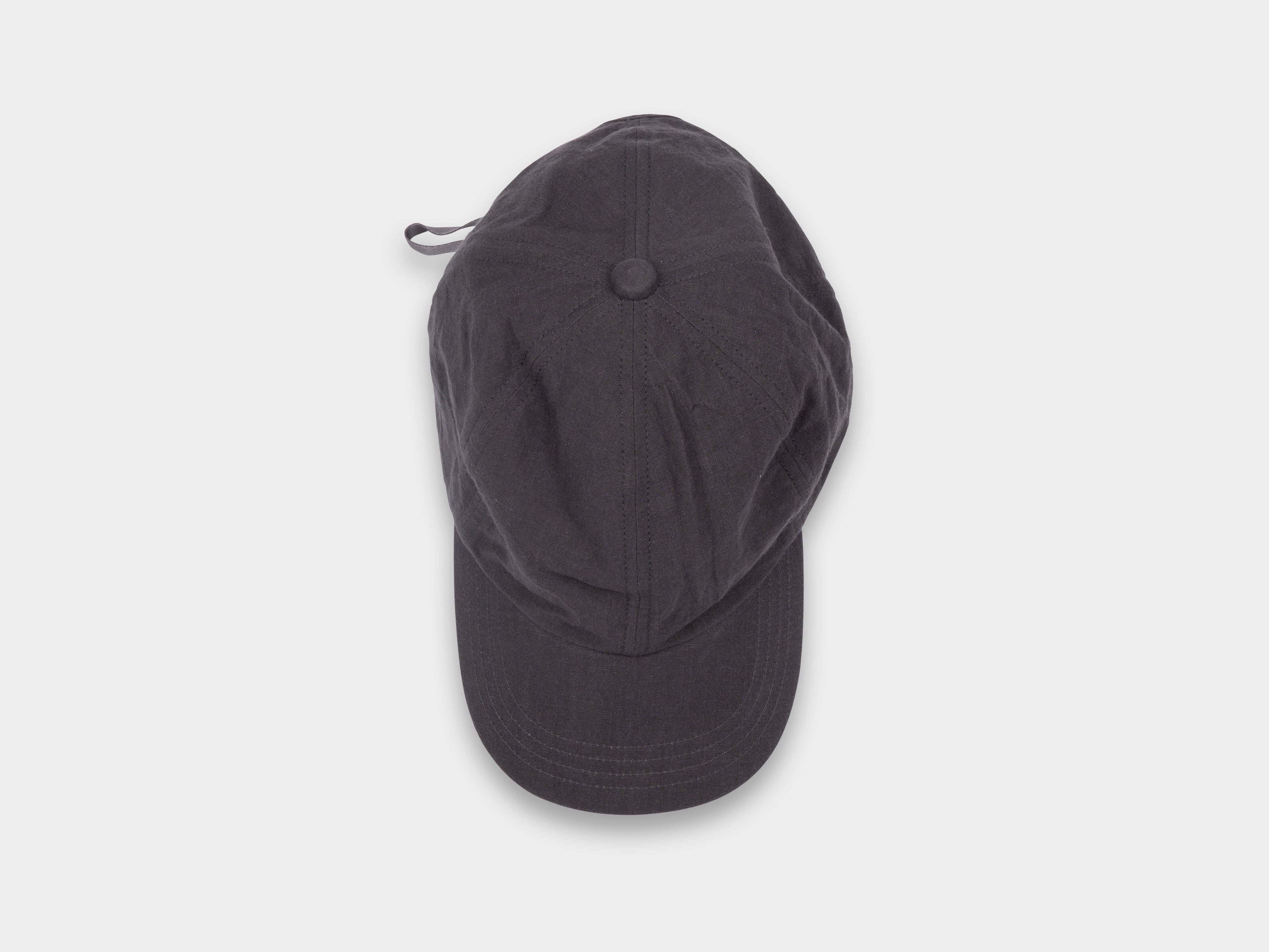 +Deep-cut six panel cap. Slot button threaded onto seatbelt tape, used to adjust size. Made in Japan.