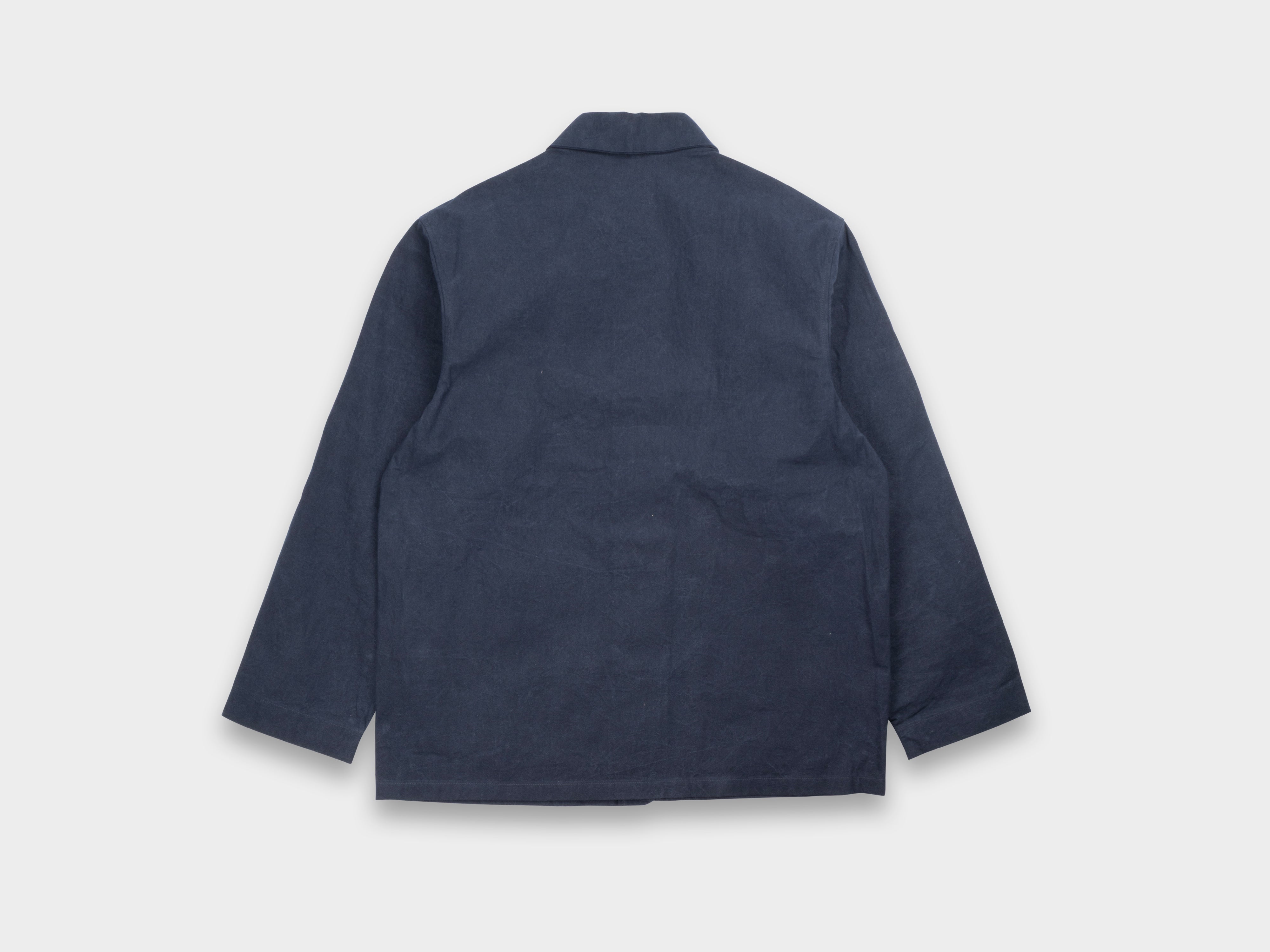 +Loose-fit chore coat. Enlarged front patch pockets, pointed collar, straight hem, slot buttons threaded onto seatbelt tape. Made in Japan.