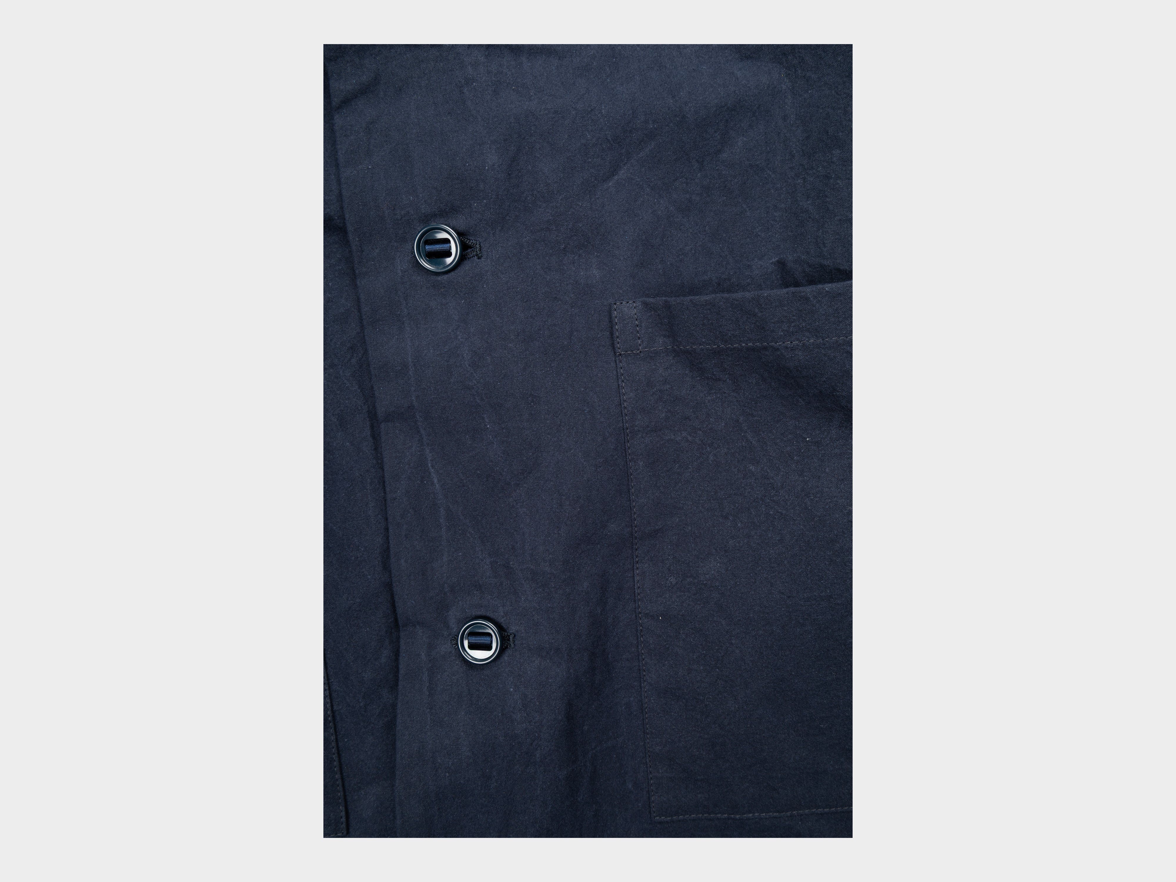 +100% cotton with a paraffin wax coating. Yarn spun and dyed in Japan using cotton grown in Australia and the USA. Woven in Shizouka, then coated and baked in paraffin wax in Fukui. This original MAN–TLE cloth, MT-Wax, is designed to reveal new sound, colour, and texture over time. At first heavyweight and naturally stiff, it softens, fades, and changes form with washing and wear, becoming personal to the body it covers. Woven for MAN–TLE in Shizuoka, Japan.