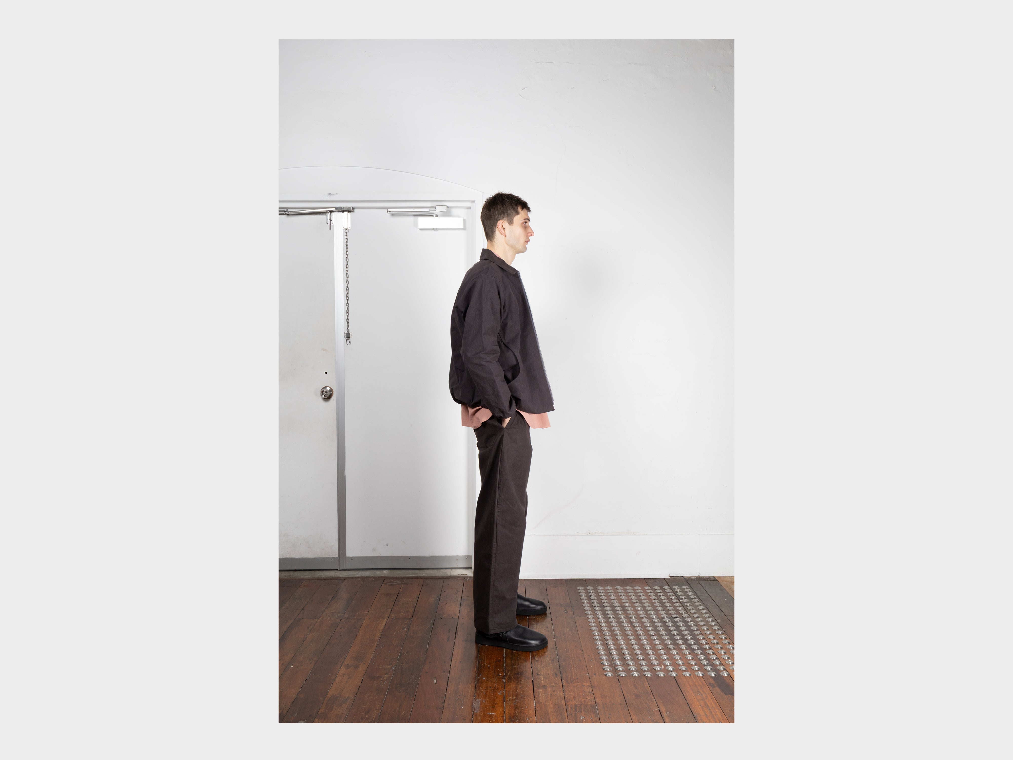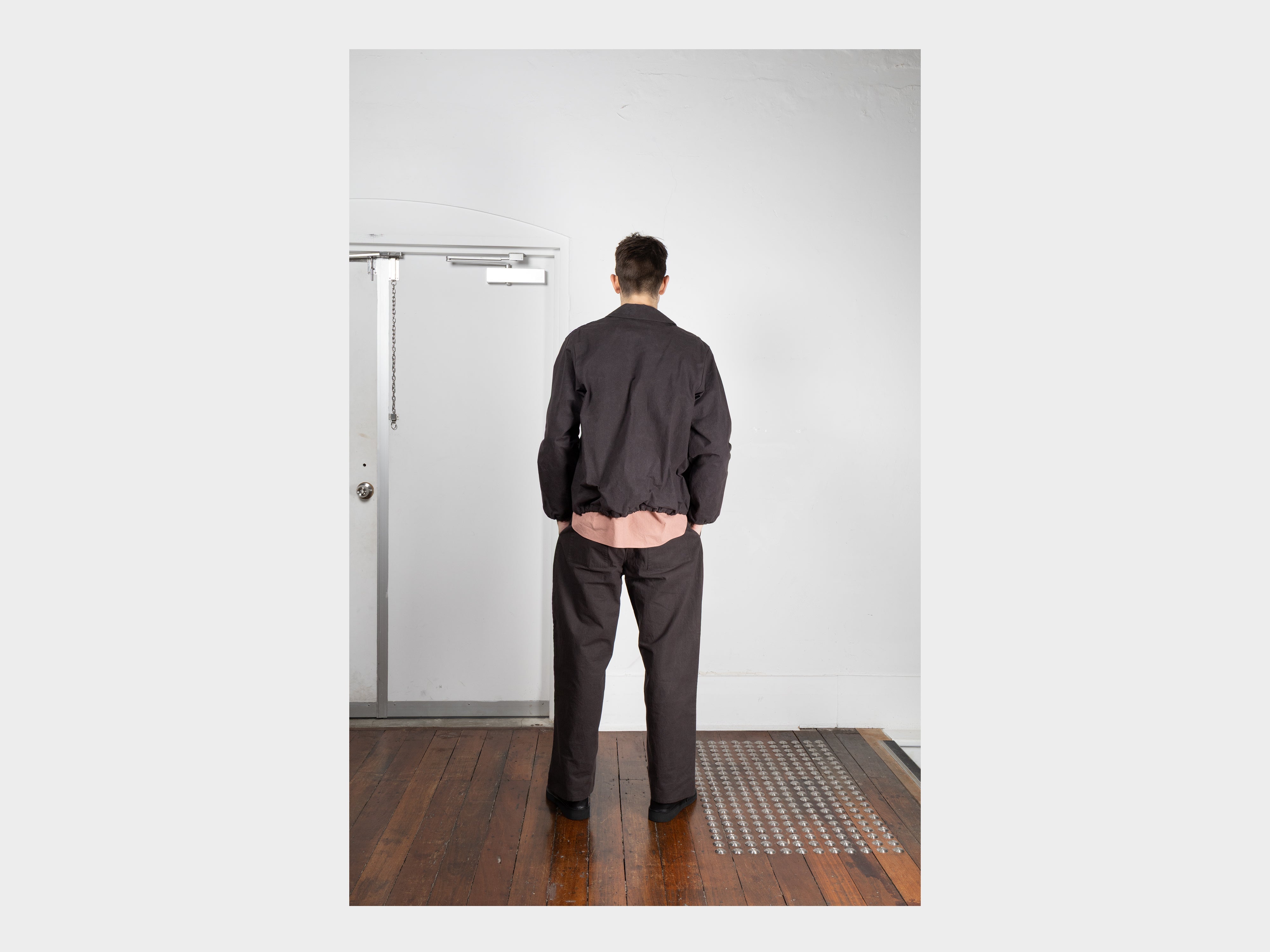 +100% cotton with a paraffin wax coating. Yarn spun and dyed in Japan using cotton grown in Australia and the USA. Woven in Shizouka, then coated and baked in paraffin wax in Fukui. This original MAN–TLE cloth, MT-Wax, is designed to reveal new sound, colour, and texture over time. At first heavyweight and naturally stiff, it softens, fades, and changes form with washing and wear, becoming personal to the body it covers. Woven for MAN–TLE in Shizuoka, Japan.