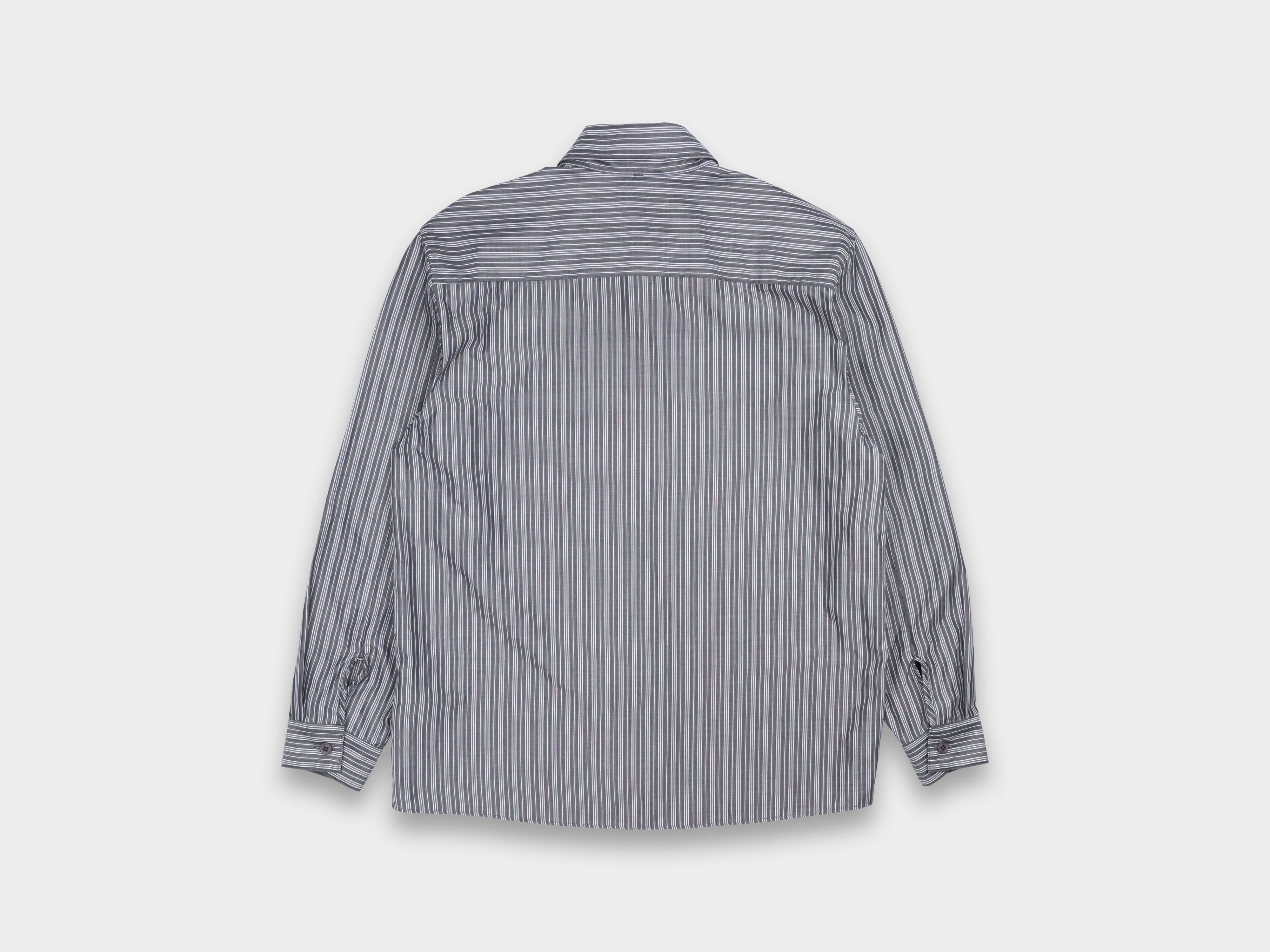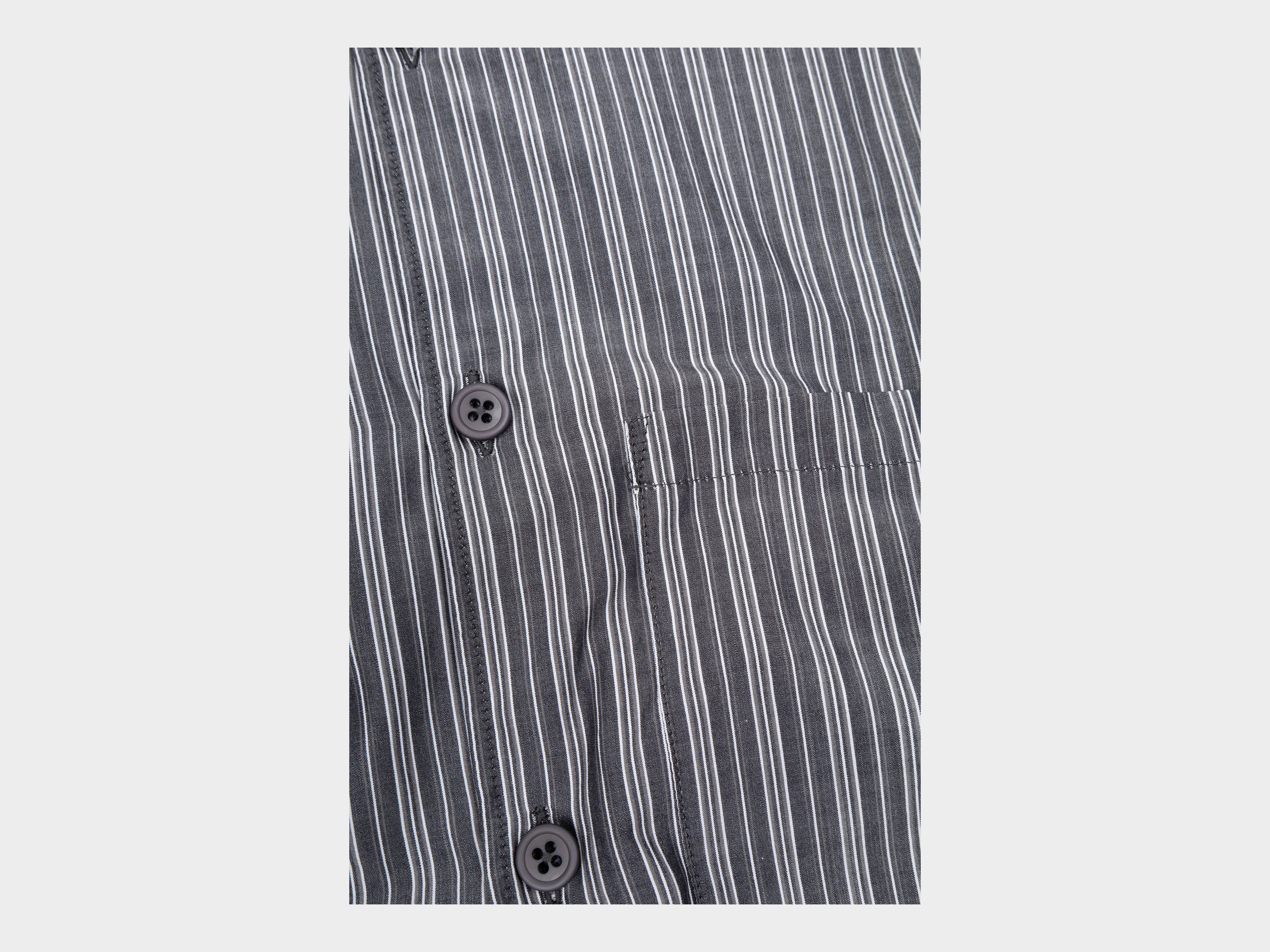 Relaxed, straight-cut shirt. Generous room through armholes, relaxed sleeves with single button closure, high stand collar, button front, large left-chest pocket. Made in Japan.