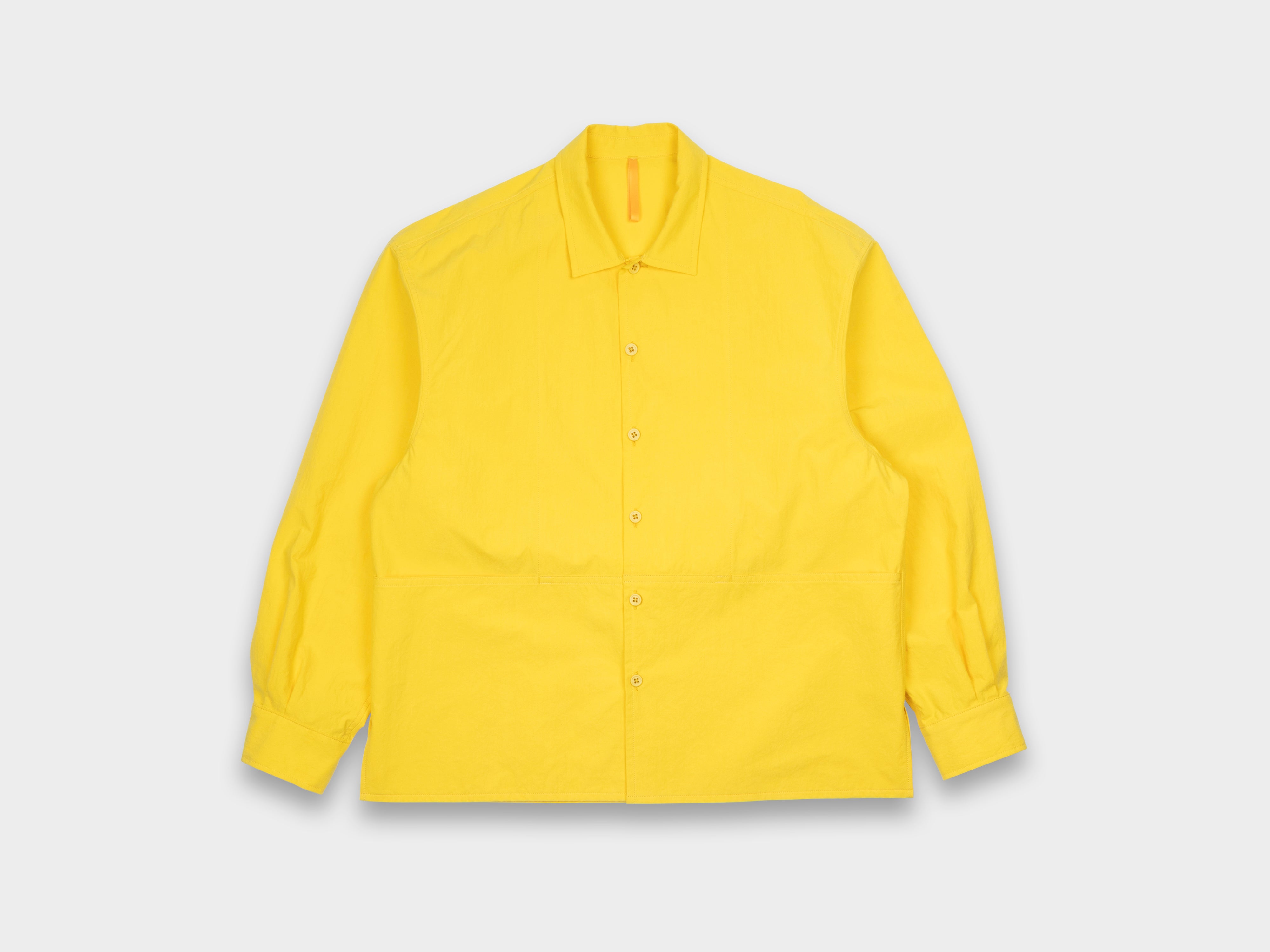 +Boxy-fit overshirt with large, full-width front pockets. Generous sleeves, pleated cuffs with single button closure, pointed collar with hidden stand, side-seam vents. Made in Japan.