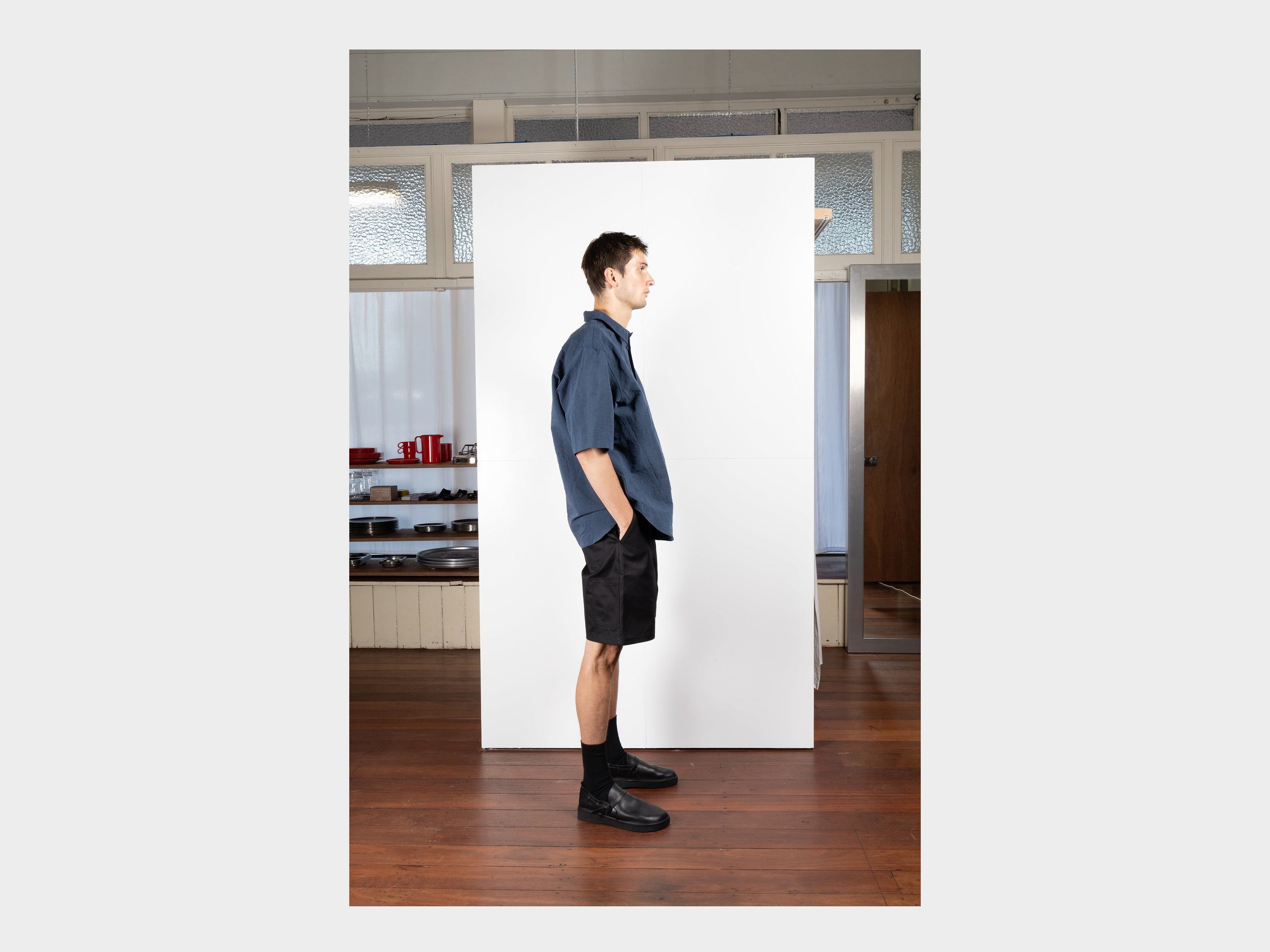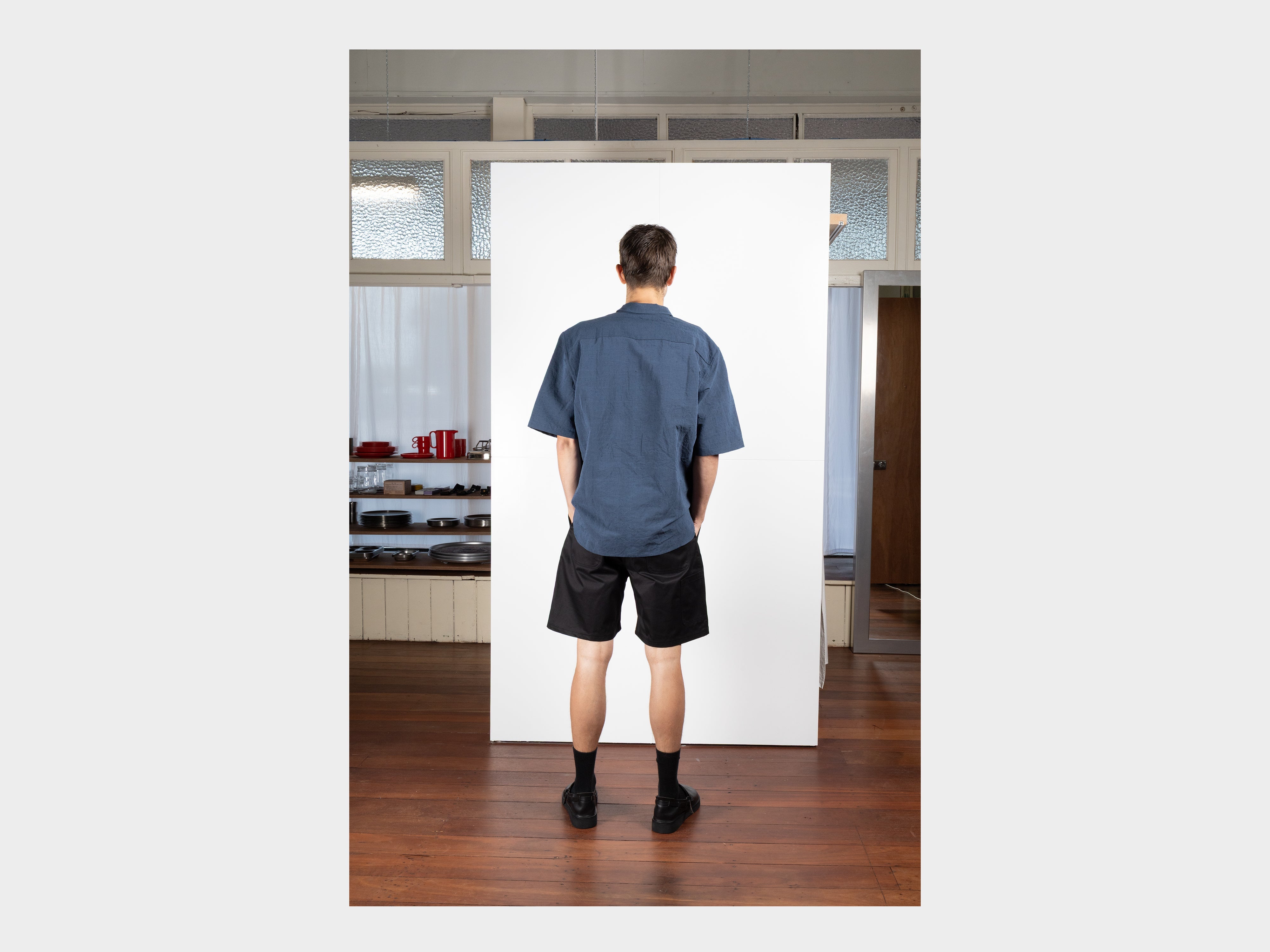 +Loose-fitting short sleeve shirt. Slightly dropped shoulders, relaxed sleeves, pointed collar, button front, curved hem. Made in Japan.